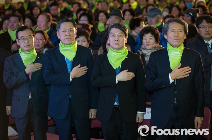 | △ 부산시당 창당대회, 국기에 대한 경례하는 안철수와 한상진 |
