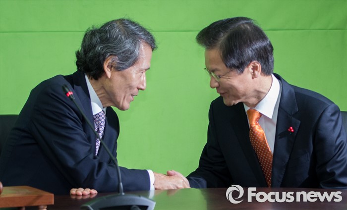 (서울=포커스뉴스) 한상진 공동창준위원장과 천정배 의원이 27일 오전 서울 마포구 국민의당 당사에서 열린 기획조정회의에서 인사를 나누고 있다