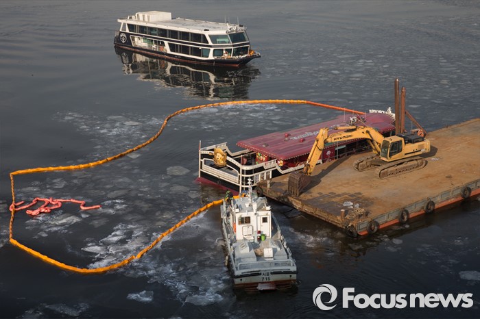 (서울=포커스뉴스) 27일 오전 서울 한강 영동대교 아래에서 침수된 한강유람선을 인양하기 위해 바지선이 정박해 있다.