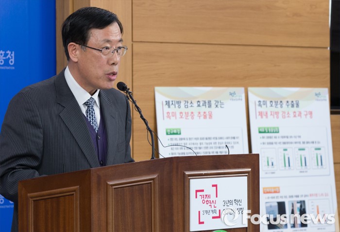 (세종=포커스뉴스) 27일 오전 세종시 정부세종청사 농림축산식품부 기자실에서 김응본 국립농업과학원자원부장이 흑미 호분층 기능선분 추출기술 개발 및 지방감소 효과 구명 관련 브리핑을 하고 있다.