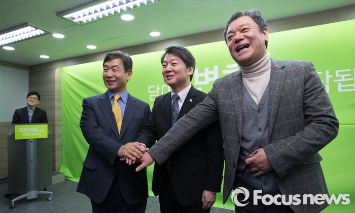(서울=포커스뉴스) 안철수 의원이 27일 오전 서울 마포구 국민의당 당사에서 입당 인사 소개를 마친 후 국민의당 홍보위원장으로 선임 된 박찬정 전 브랜드 앤 컴퍼니 상무이사와 언론특보로 선임 된 한명규 코라오 그룹 부회장과 함께 포토타임을 갖고 있다.