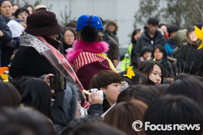 (서울=포커스뉴스) 27일 오후 서울 종로구 구 일본대사관 앞에서 열린 제 1215차 일본군 위안부 문제 해결을 위한 정기수요집회에 참석한 이용수 할머니가 학생들과 함께 집회를 하고 있다.