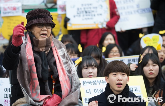 (서울=포커스뉴스) 27일 오후 서울 종로구 구 일본대사관 앞에서 열린 제 1215차 일본군 위안부 문제 해결을 위한 정기수요집회에 참석한 이용수 할머니가 학생들과 함께 구호를 외치고 있다.