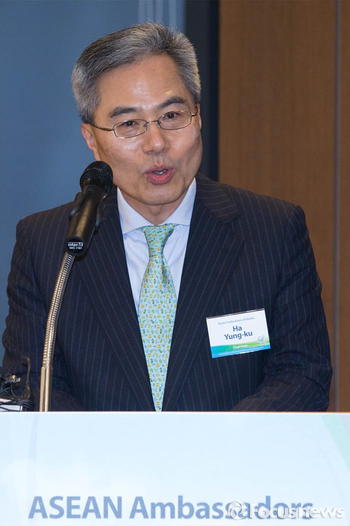 또 하영구 회장은 개인종합계좌(ISA·Individual savings account) 개설 시 해당 은행의 예·적금 상품 편입에 대해서도 적극 옹호했다. 하 회장은 "3억원 이상을 투자하는 고객의 경우에는 해당은행의 예금상품을 편입할 수 있게 되어 있다. 3억 미만의 경우가 안되는 것은 차별적이다"고 반박했다.(서울=포커스뉴스) 24일 오후 서울 중구 명동 11길 은행회관 뱅커스클럽에서 열린 금융회사 해외진출 지원을 위한 주한 아세안국가 대사 초청 만찬 간담회에 하영구 은행연합회장이 건배사를 하고 있다. 2015.08.24 김유근 기자