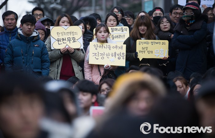 (서울=포커스뉴스) 27일 오후 서울 종로구 구 일본대사관 앞에서 열린 제 1215차 일본군 위안부 문제 해결을 위한 정기수요집회에 참석한 학생들이 피켓을 들고 있다.
