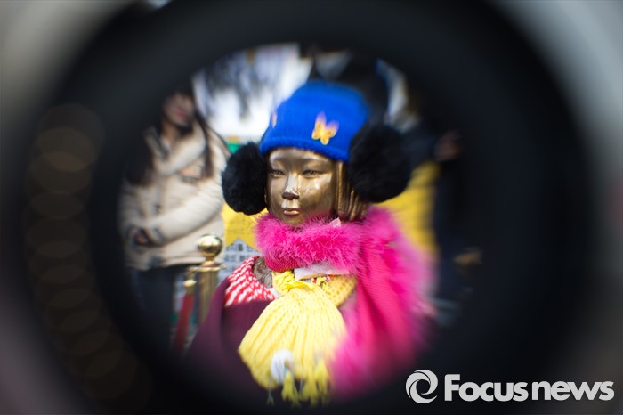 (서울=포커스뉴스) 27일 오후 서울 종로구 구 일본대사관 앞에서 열린 제 1215차 일본군 위안부 문제 해결을 위한 정기수요집회에서 소녀상이 자리를 지키고 있다.