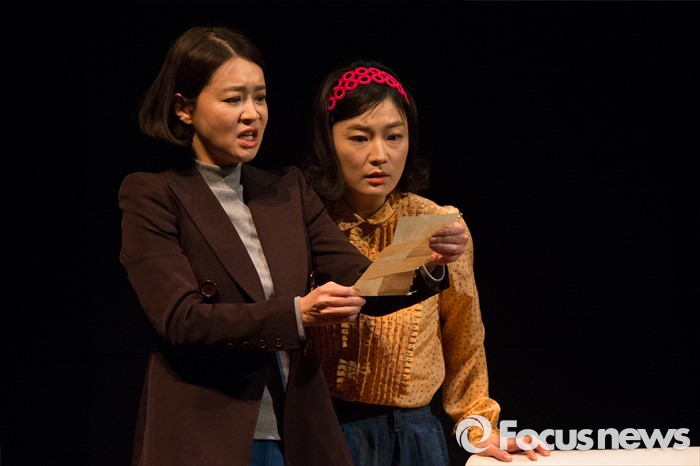 (서울=포커스뉴스) 27일 오전 서울 중구 명동예술극장에서 열린 연극 '날 보러와요' 프레스콜에 배우 이항나(박기자)와 공상아(미스김)이 연기하고 있다.