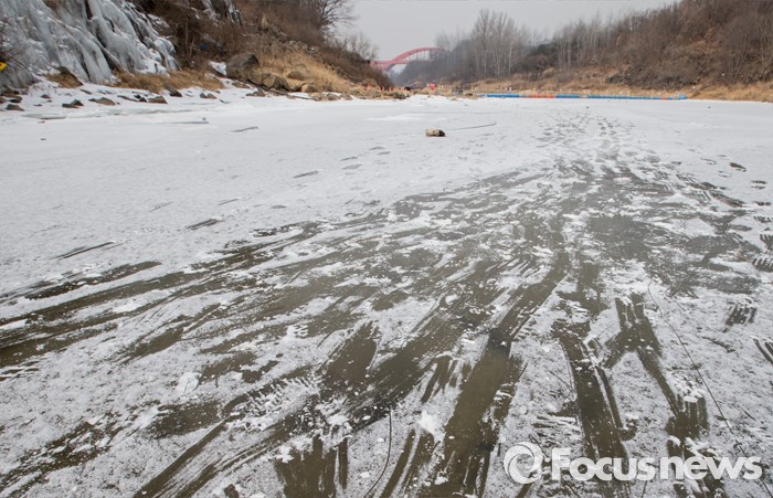 (철원=포커스뉴스) 26일 강원 철원군 현무암 협곡 주상절리 아래로 얼어붙은 한탄강 위에 여행객들의 발자국이 남아 있다.