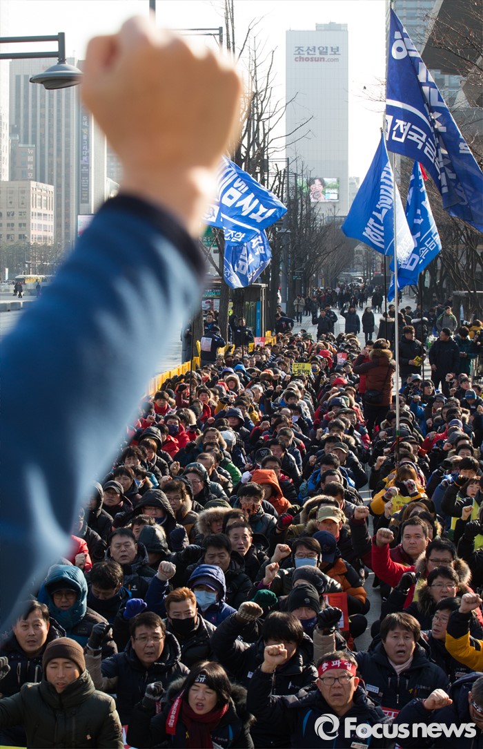 (서울=포커스뉴스) 27일 오후 서울 종로구 세종로 소공원에서 열린 '민주노총 총파업 수도권대회'에 참가한 민주노총 조합원들이 정부의 노동법 개정 중단을 촉구하는 구호를 외치고 있다.