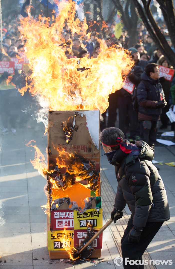 (서울=포커스뉴스) 27일 오후 서울 종로구 세종로 소공원에서 열린 '민주노총 총파업 수도권대회'에 참가한 민주노총 조합원들이 정부의 노동법 개정 중단을 촉구하는 퍼포먼스를 펼치고 있다.