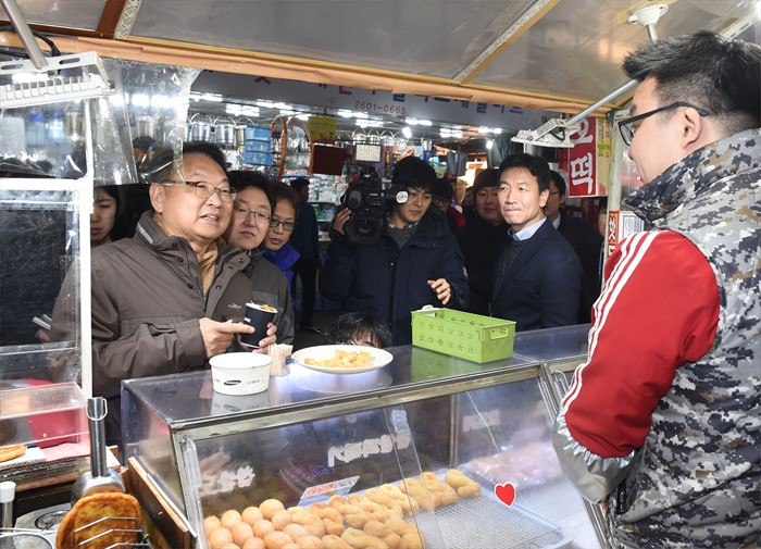 (서울=포커스뉴스) 유일호 부총리 겸 기획재정부 장관이 27일 오후 설 민생대책 후속조치일환으로 설맞이 전통시장 그랜드세일행사를 하고 있는 서울 양천구 신영시장을 방문해 성수품을 구입하고 있다. <사진제공=기획재정부>