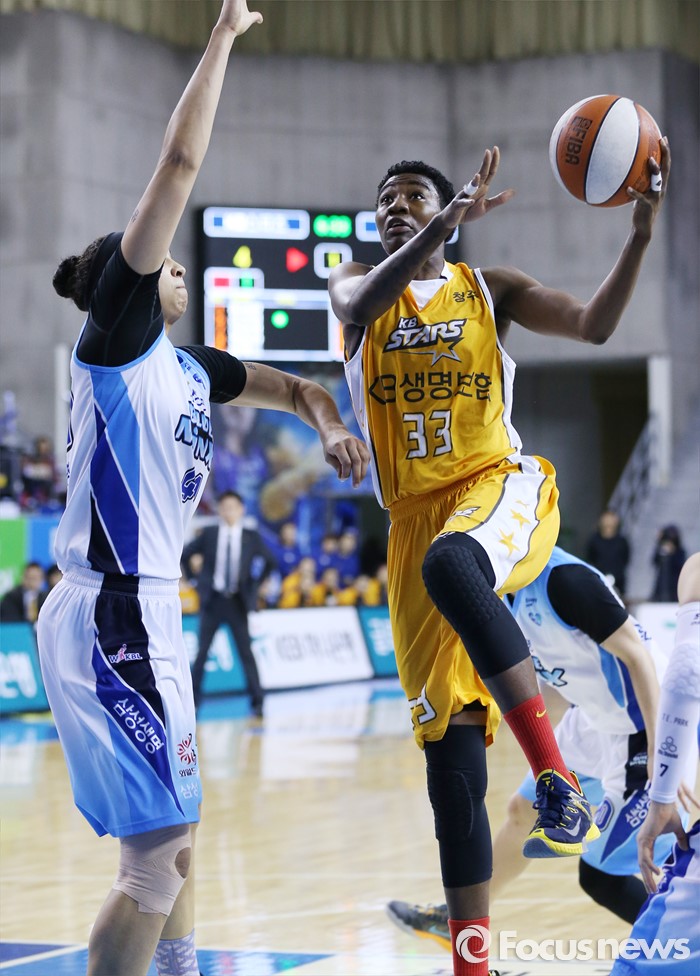 (용인=포커스뉴스) 27일 용인실내체육관에서 열린 2015-2016 여자프로농구 삼성생명-KB스타즈 경기에서 KB스타즈 하워드가 삼성생명 스톡스를 앞에 두고 레이업슛을 시도하고 있다.