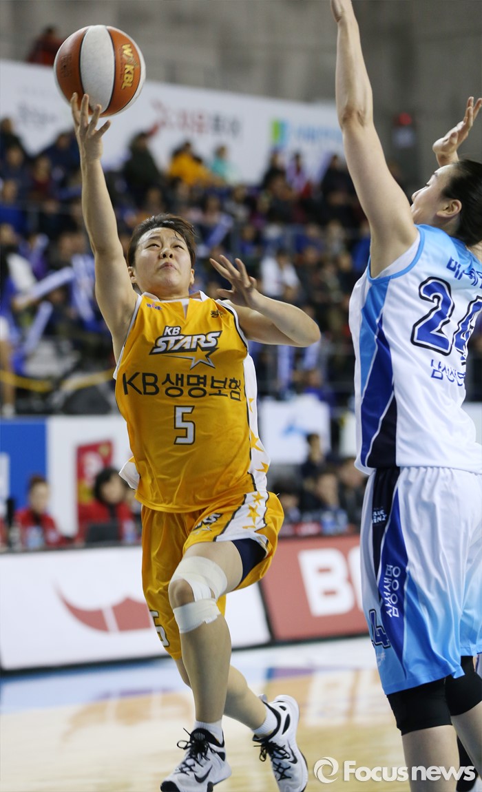 (용인=포커스뉴스) 27일 용인실내체육관에서 열린 2015-2016 여자프로농구 삼성생명-KB스타즈 경기에서 KB스타즈 심성영(5)이 삼성생명 배혜윤의 마크를 받으며 레이업슛을 시도하고 있다.