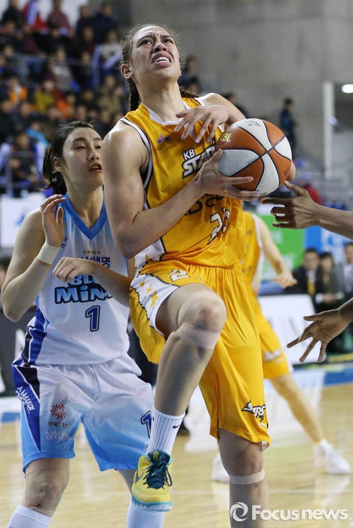 (용인=포커스뉴스) 27일 용인실내체육관에서 열린 2015-2016 여자프로농구 삼성생명-KB스타즈 경기에서 KB스타즈 햄비가 슈팅을 시도하다 수비에 걸려 볼을 놓치고 있다.