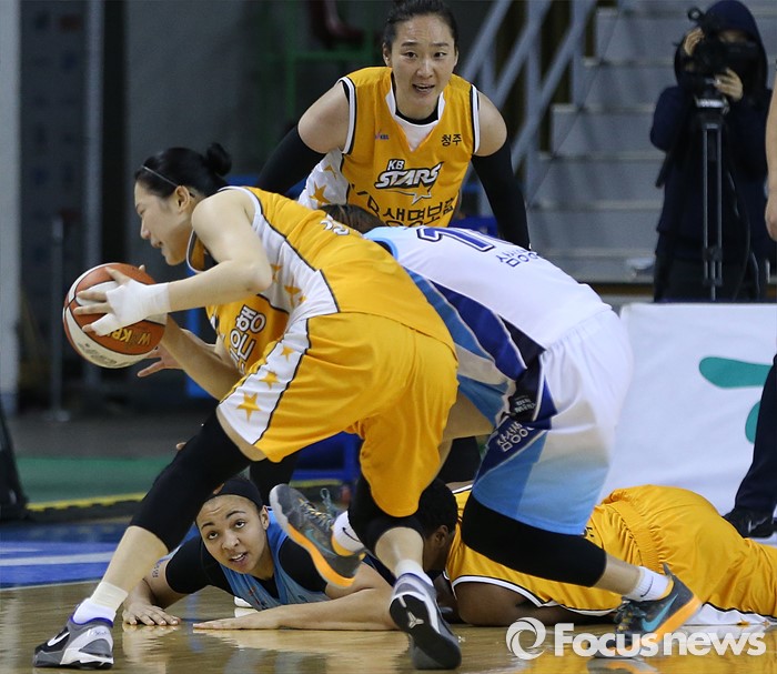 (용인=포커스뉴스) 27일 용인실내체육관에서 열린 2015-2016 여자프로농구 삼성생명-KB스타즈 경기에서 KB스타즈 강아정이 삼성생명 고아라에 앞서 바운드된 볼을 잡고있다.