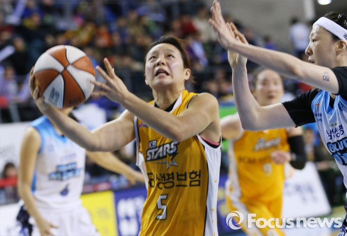 (용인=포커스뉴스) 27일 용인실내체육관에서 열린 2015-2016 여자프로농구 삼성생명-KB스타즈 경기에서 KB스타즈 심성영이 삼성생명 이미선의 마크를 뿌리치며 레이업슛을 시도하고 있다.