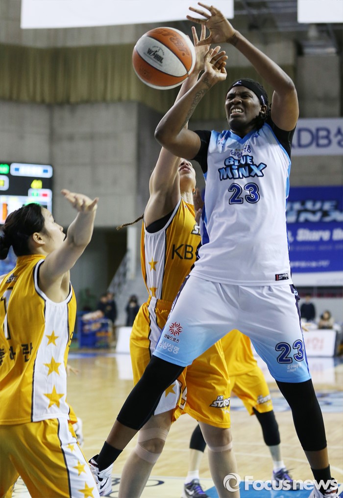 (용인=포커스뉴스) 27일 용인실내체육관에서 열린 2015-2016 여자프로농구 삼성생명-KB스타즈 경기에서 삼성생명 해리스의 슈팅을 KB스타즈 햄비와 홍아란이 저지하고 있다.