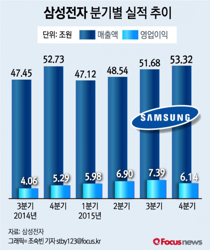 한편 삼성전자는 지난해 4분기에 6조1400억원의 영업이익을 기록했다. 이는 전년 동기인 2014년 4분기(5조2884억원)보다 16.15% 증가한 실적이다. 지난해 3분기(7조3934억원)에 비해서는 16.92% 감소했다.