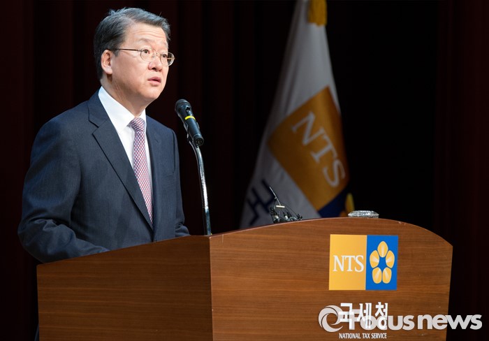 (세종=포커스뉴스) 임환수 국세청장이 28일 오전 세종시 정부세종2청사 국세청에서 열린 전국세무관서장회의에 참석해 당부말을 전하고 있다.
