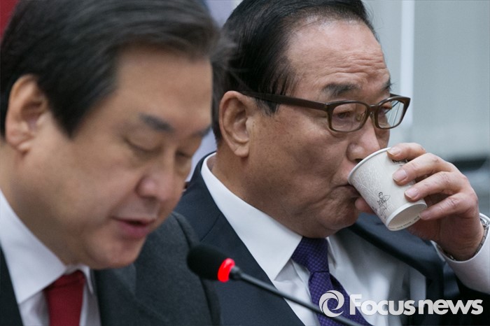 (서울=포커스뉴스) 김무성(왼쪽) 새누리당 대표가 28일 오전 서울 여의도 국회에서 열린 최고위원회의에 참석해 모두발언하는 동안, 서청원 최고위원이 물을 마시고 있다.