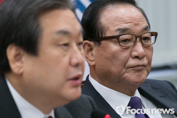 (서울=포커스뉴스) 김무성(왼쪽) 새누리당 대표가 28일 오전 서울 여의도 국회에서 열린 최고위원회의에 참석해 모두발언하는 동안 서청원 최고위원이 경청하고 있다.