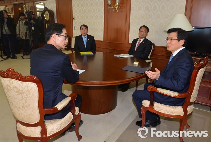 (서울=포커스뉴스) 28일 오전 서울 종로구 정부서울청사에서이준식(왼쪽부터 시계방향으로) 사회부총리 겸 교육부장관, 이석준 국무조정실장, 유일호 경제부총리 겸 기획재정부 장관, 황교안 총리가 총리-부총리 협의회에 앞서 이야기를 나누고 있다.