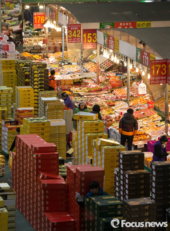 (대전=포커스뉴스) 설 멸정을 앞두고 28일 오전 대전 유성구 농수산물도매시장에서 상인들이 대목준비에 바쁘게 움직이고 있다.
