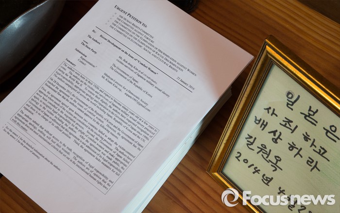 (서울=포커스뉴스) 28일 오전 서울 마포구 평화의 우리집에서 열린 일본군'위안부' 문제합의 관련, 유엔 청원서 제출 기자회견에 쌓여있는 청원서.