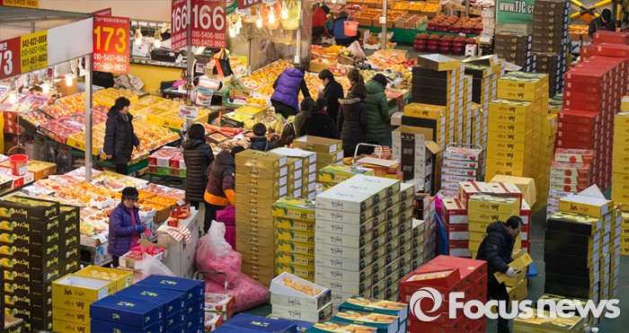 (대전=포커스뉴스) 설 멸정을 앞두고 28일 오전 대전 유성구 농수산물도매시장에서 상인들이 대목준비에 바쁘게 움직이고 있다.