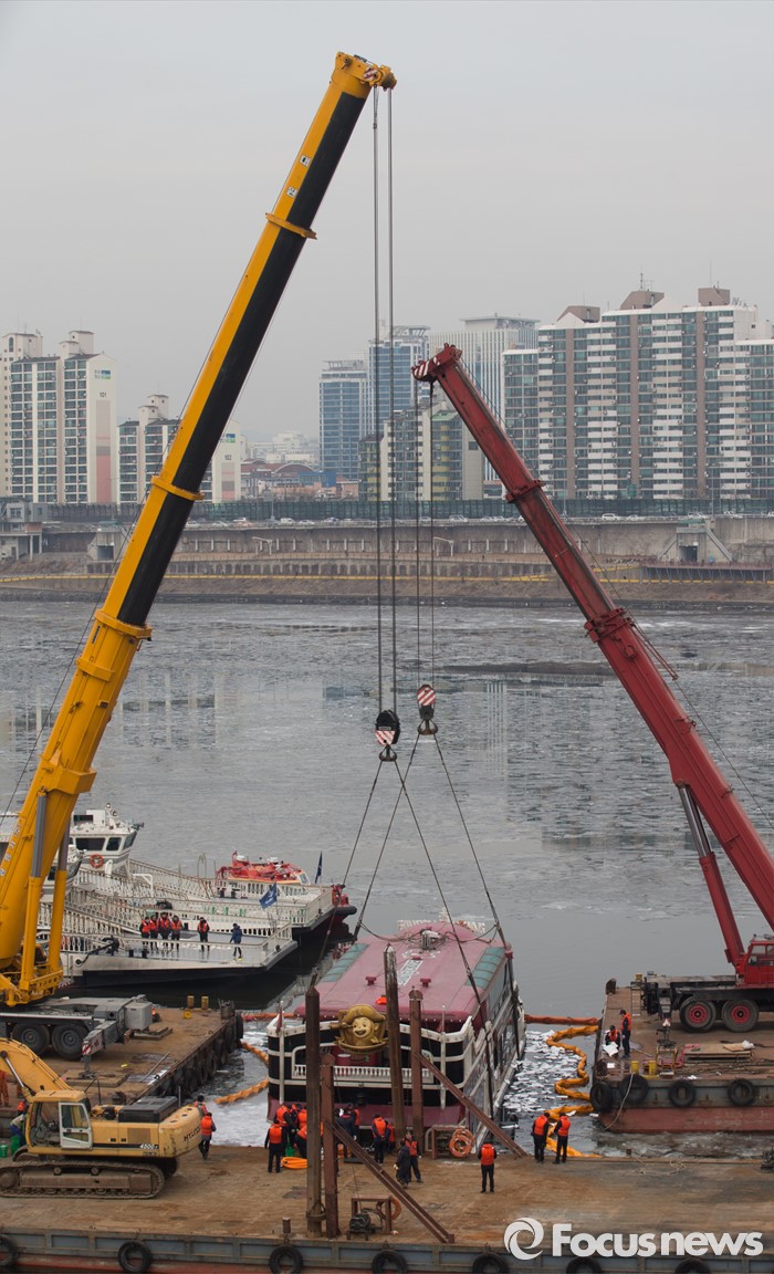 (서울=포커스뉴스) 28일 오후 서울 한강 영동대교 인근에서 침수된 이랜드 크루즈 유람선 인양 작업이 진행되고 있다.