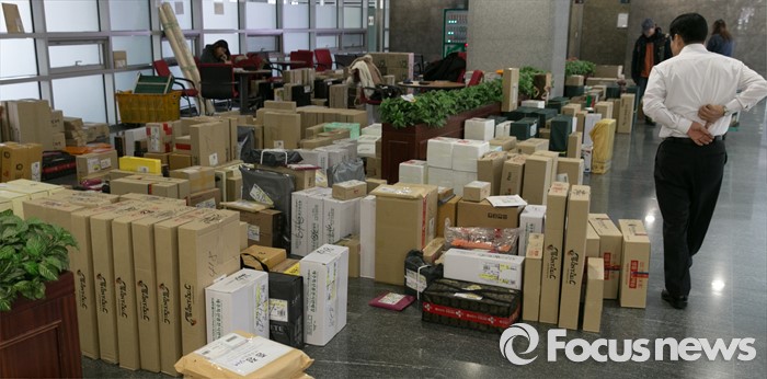 (서울=포커스뉴스) 설을 열흘여 앞둔 28일 오후 서울 여의도 국회 의원회관에 의실로 배달된 택배들이 쌓여 있다.