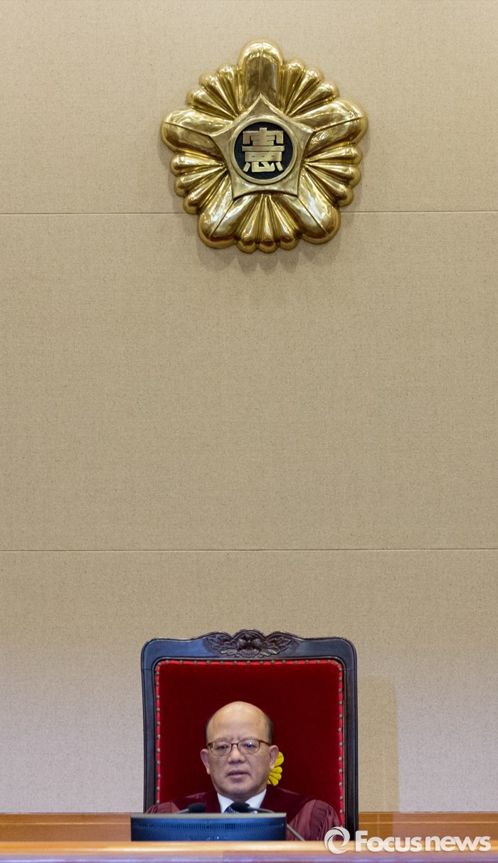 (서울=포커스뉴스) 28일 오후 서울 종로구 헌법재판소 대심판정에서 박한철 헌법재판소장이 국회 선진화법 권한쟁의 공개변론 시작을 기다리고 있다.