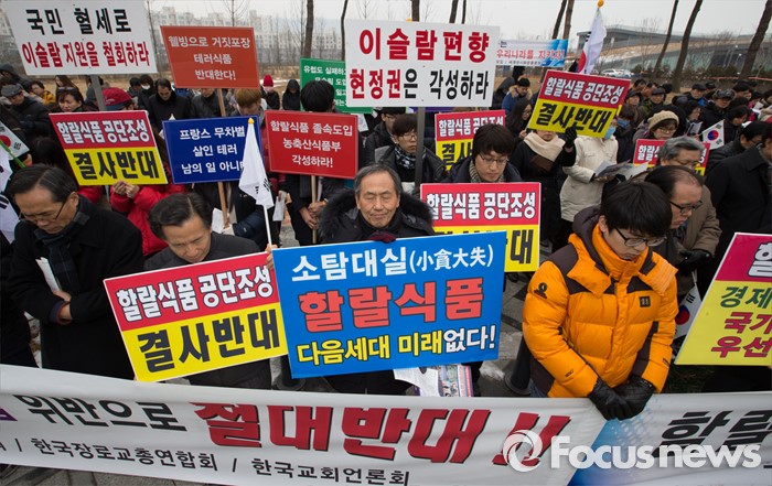 (세종=포커스뉴스) 28일 오후 세종시 정부세종청사 1동 앞에서 한국기독교총연합회, 한국교회연합회, 한국장로교총연합회, 한국교회언론회 등 종교인들이 집회를 갖고 할랄식품 테마단지 추진을 중단할 것을 촉구하고 있다.