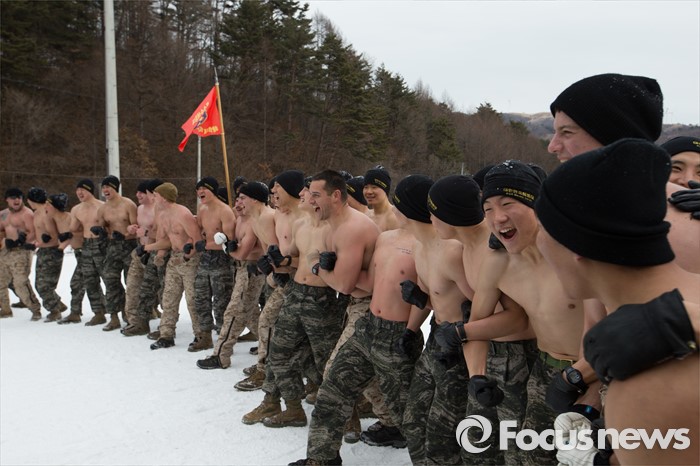 (평창=포커스뉴스) 28일 강원도 평창군 황병산 해병대 산악 종합훈련장에서 열린 '한·미 해병대 연합 동계 설한지 훈련'에 해병대 수색대대와 미 해병대 3사단 수색중대 장병들이 참가하고 있다.
