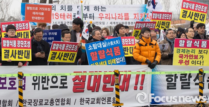 (세종=포커스뉴스) 28일 오후 세종시 정부세종청사 1동 앞에서 한국기독교총연합회, 한국교회연합회, 한국장로교총연합회, 한국교회언론회 등 종교인들이 집회를 갖고 할랄식품 테마단지 추진을 중단할 것을 촉구하고 있다.