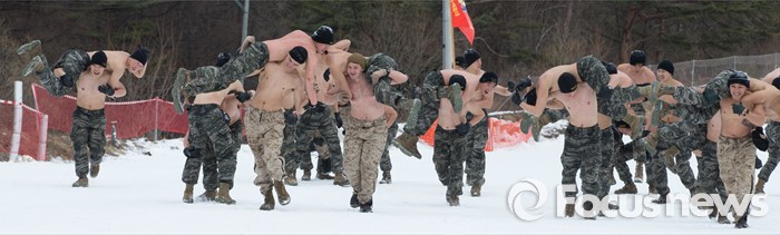 (평창=포커스뉴스) 28일 강원도 평창군 황병산 해병대 산악 종합훈련장에서 열린 '한·미 해병대 연합 동계 설한지 훈련'에 해병대 수색대대와 미 해병대 3사단 수색중대 장병들이 참가하고 있다.