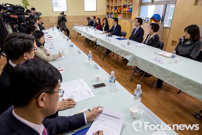 (서울=포커스뉴스) 만3-5세 유아에게 공통적으로 제공하는 교육, 보육 과정인 누리과정 예산 파행으로 보육대란이 이어지고 있는 28일 오후 서울 종로구 한 어린이집을 찾은 황교안 국무총리가 교사들과 간담회에 앞서 인사말을 하고 있다.