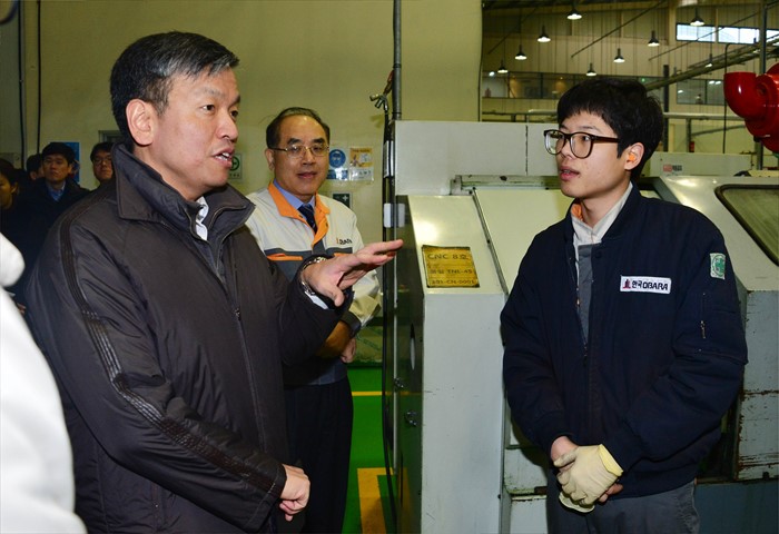 (화성=포커스뉴스) 최상목 기획재정부 차관이 28일 경기 화성시 소재 한국오바라(주)를 현장 방문해 기업 현장을 시찰하며 청년근로자들과 대화를 하고 있다. <사진제공=기획재정부>