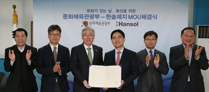 (서울=포커스뉴스) 28일 서울 용산구 국립극단 회의실에서 '문화가 있는 날' 확산을 위한 업무협약(MOU) 체결식에서 김종덕 문화체육관광부 장관과 이상훈 한솔제지 대표이사가 업무협약서에 서명을 마친 뒤 기념촬영을 하고 있다. <사진제공=문화체육관광부>