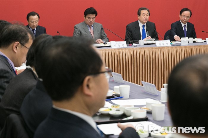 (서울=포커스뉴스) 김무성(뒷줄 오른쪽 두번째) 새누리당 대표가 29일 오전 서울 여의도 국회에서 열린 저출산 대책 당정협의에 참석해 모두발언하고 있다.