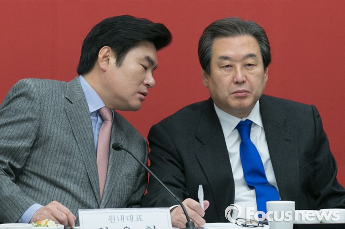 (서울=포커스뉴스) 김무성(오른쪽) 새누리당 대표와 원유철 원내대표가 29일 오전 서울 여의도 국회에서 열린 저출산 대책 당정협의에 참석해 대화하고 있다.