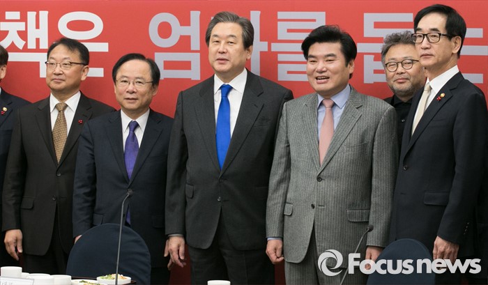 (서울=포커스뉴스) 김무성(왼쪽 세번째) 새누리당 대표와 유일호(왼쪽) 경제부총리 겸 기획재정부 장관 등 참석자들이 29일 오전 서울 여의도 국회에서 열린 저출산 대책 당정협의에 참석해 기념사진을 찍고 있다. 왼쪽부터 유 부총리, 이주영 저출산대책특위 위원장, 김 대표, 원유철 원내대표, 조동원 홍보기획본부장, 이준식 사회부총리 겸 교육부 장관.