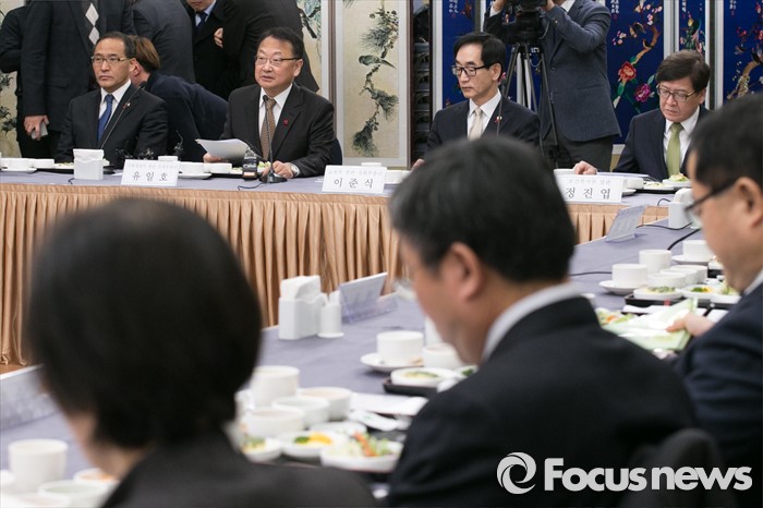 (서울=포커스뉴스) 유일호(뒷줄 왼쪽 두번째) 경제부총리 겸 기획재정부 장관이 29일 오전 서울 여의도 국회에서 열린 저출산 대책 당정협의에 참석해 모두발언하고 있다.