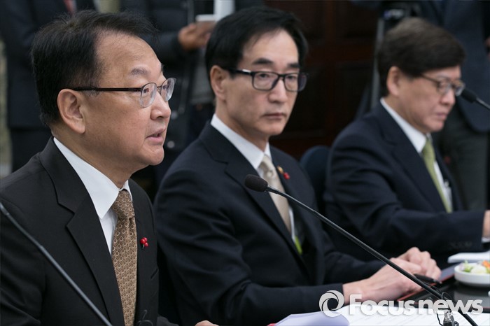 (서울=포커스뉴스) 유일호(왼쪽) 경제부총리 겸 기획재정부 장관이 29일 오전 서울 여의도 국회에서 열린 저출산 대책 당정협의에 참석해 모두발언하고 있다.