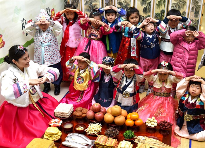 (서울=포커스뉴스) 설 명절을 열흘여 앞둔 28일 서울 서초구 하나로클럽 양재점에서 한복을 차려입은 어린이들이 세배하는 법을 배우고 있다. <사진제공=농협유통>