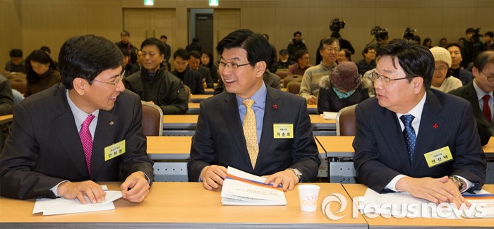 (세종=포커스뉴스) 29일 오전 세종시 정부세종컨벤션센터 국제회의장에서 열린 국가균형발전선언 12주년 기념행사에서 안희정(왼쪽부터) 충남지사, 이춘희 세종시장, 권선택 대전시장이 대화하고 있다.