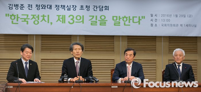 (서울=포커스뉴스) 29일 오후 서울 여의도 국회 의원회관에서 열린 '참여정부 시절 청와대 정책실장을 지낸 김병준 국민대 교수 초청 간담회, 한국정체 제3의 길을 말한다'에 참석한 한상진 국민의당 공동창당준비위원장이 인사말을 하고 있다. 왼쪽부터 안철수 국민의당 인재영입위원장, 김 교수, 한 위원장, 김한길 상임부위원장.