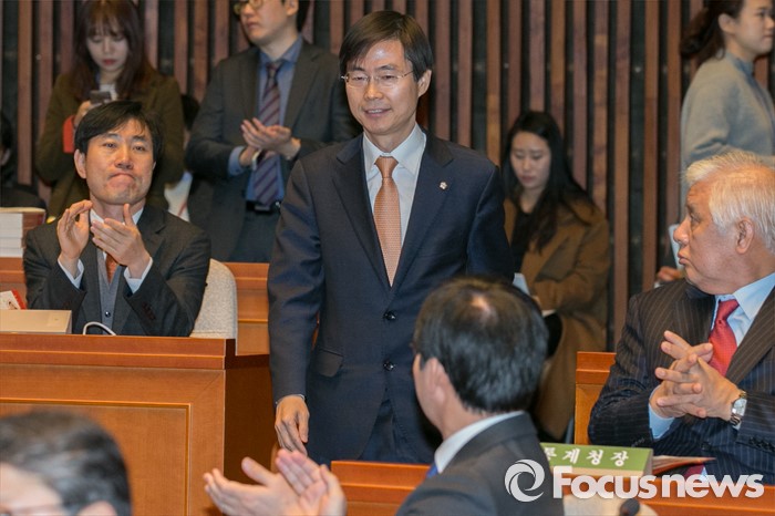 (서울=포커스뉴스) 새누리당에 입당한 조경태(가운데) 의원이 29일 오후 서울 여의도 국회에서 열린 새누리당 의원총회에 참석해 의원들로부터 박수를 받고 있다.
