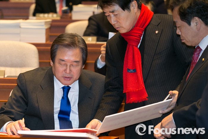 (서울=포커스뉴스) 김무성(왼쪽) 새누리당 대표가 29일 오후 서울 여의도 국회에서 열린 의원총회에 참석해 장윤석(가운데) 의원과 손팻말을 보며 대화하고 있다.
