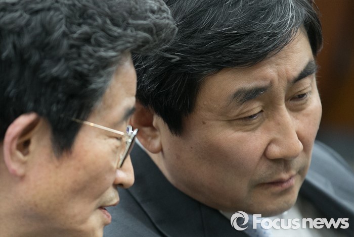 (서울=포커스뉴스) 이종걸(오른쪽) 더불어민주당 원내대표와 이목희 정책위의장이 29일 오후 서울 여의도 국회에서 열린 의원총회에 참석해 대화하고 있다.